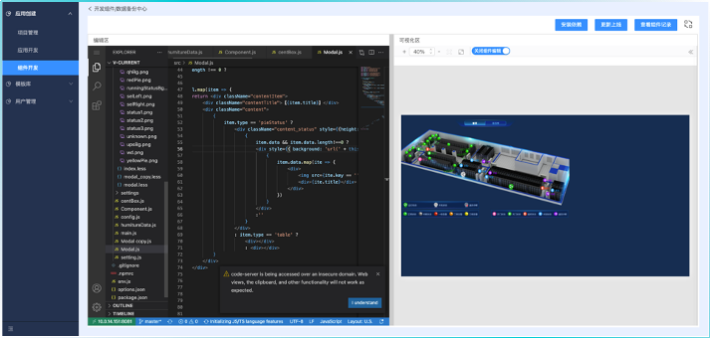 可在线开发组件,也可将已有组件直接导入,开发完成的组件需上传组件库才能用于项目。