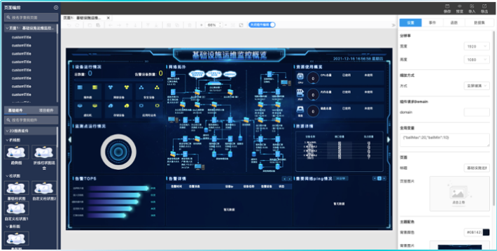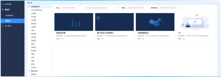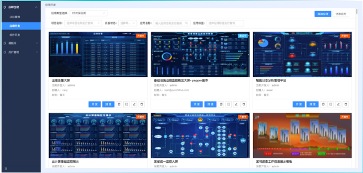 开发应用:配置大屏页面、组件信息。组件作为最小元素拼接出所有页面的展示信息。同时组件可作为按钮联动多个页面的交互。