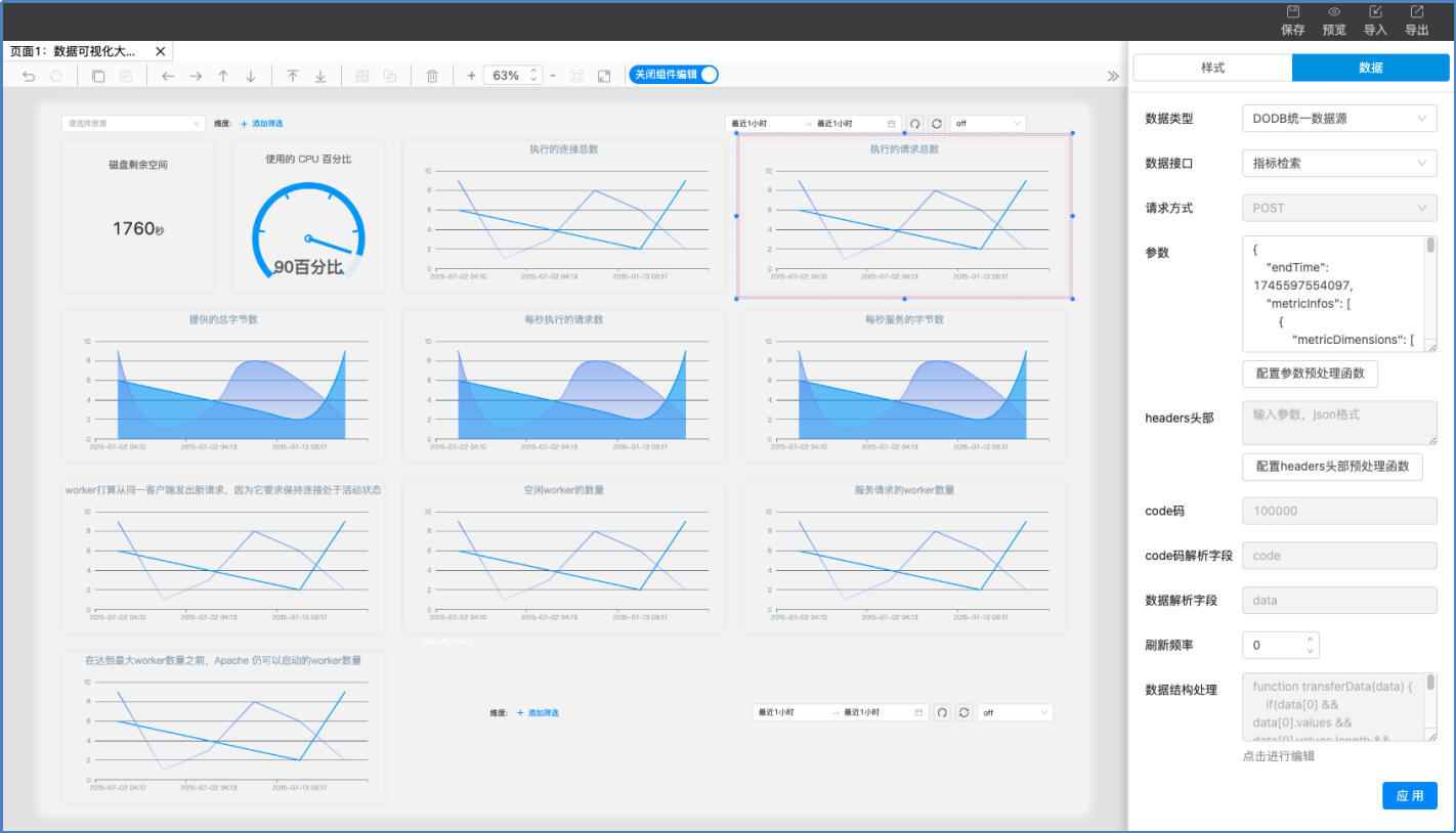 内置各种常用组件,用于应用开发。包括仪表盘、水波球、看板、线图看板、面积趋势图、趋势图、筛选条件等。