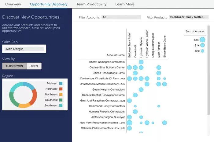 Salesforce Einstein Analytics 给用户提供了对其Salesforce数据的清晰视图,从而帮助用户突出关键的性能指标和趋势。Einstein Analytics平台允许用户使用Salesforce和非Salesforce数据构建自定义的点选和单击交互式可视化、仪表板,并使用集成的自助服务数据准备进行分析。此外,Salesforce Einstein还为销售、服务、B2B营销和人工智能辅助发现提供专门的应用程序。