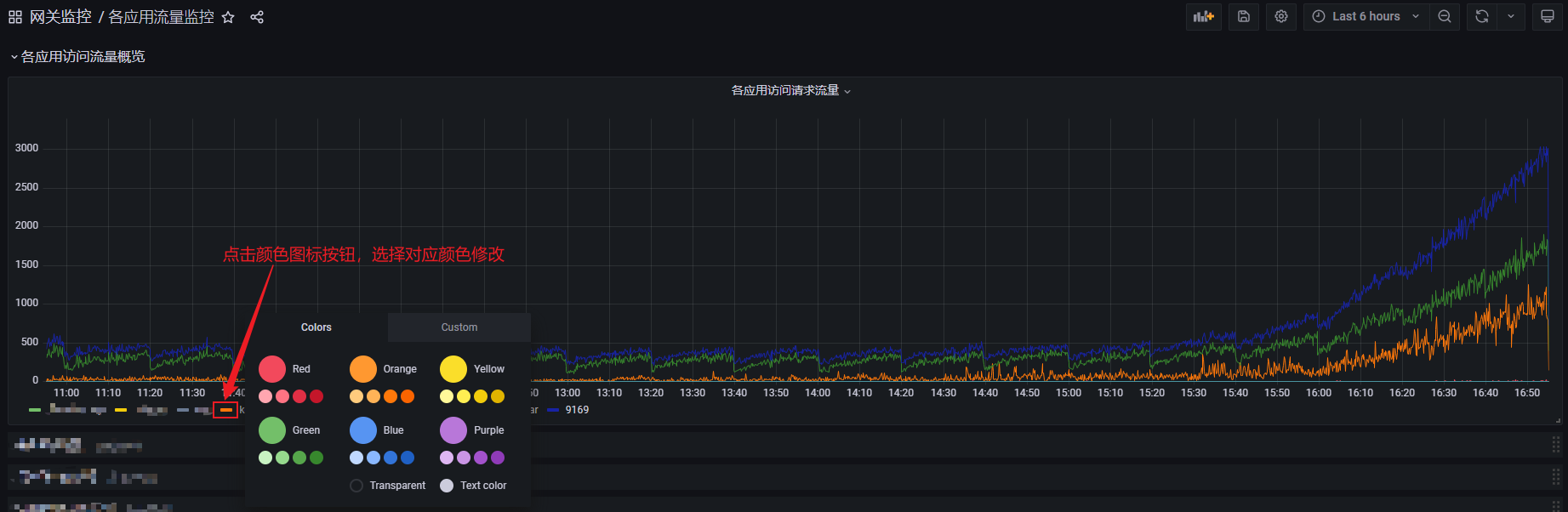 如果需要调整各个应用走势曲线的颜色,可以在展示效果页面上,点击要修改的应用对应的颜色,选择对应颜色即可,可参考下图: