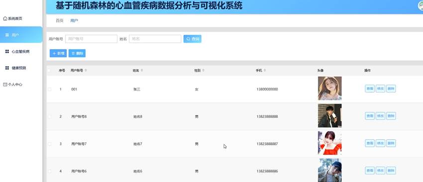 管理员点击用户管理模块,可以对系统现有的用户账号,姓名,性别,年龄,手机号等信息进行查看,修改,删除和新增的操作。