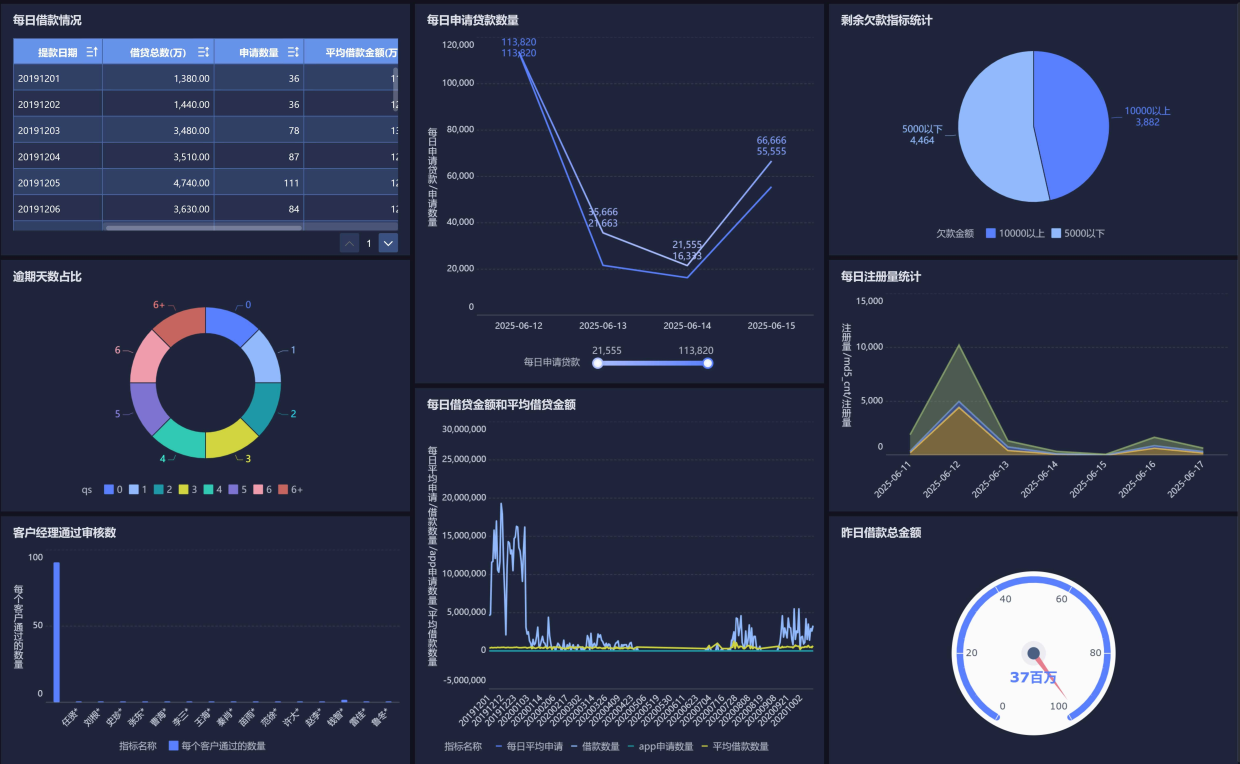 统计指标:审核通过金额,信用审核分数,通过申请量,拒绝申请量,通过人数,拒绝人数
