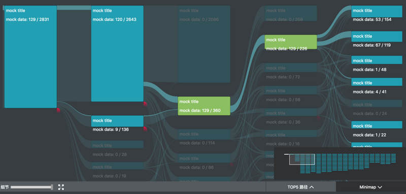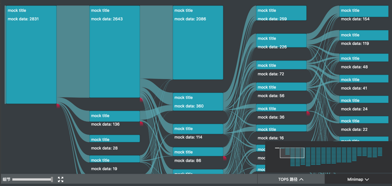 我参与的 UBA (User Behavior Analytics 内部项目) 项目中,正好用到了桑基图。除了上述的图形绘制之外,主要复杂的是交互。