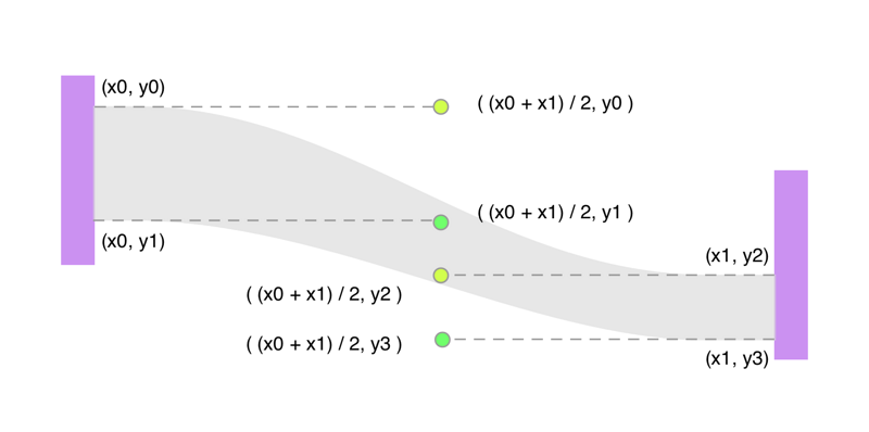 以上操作可以通过遍历每个 node 的 sourceLinks 和 targetLinks 来计算。得到边的四个端点以后,就可以算出三次贝塞尔曲线的控制点了: