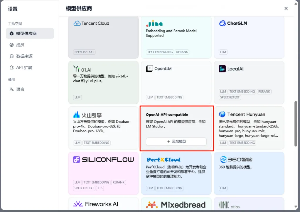 选择模型供应商中的OpenAI-API-compatible模块。点击添加模型。