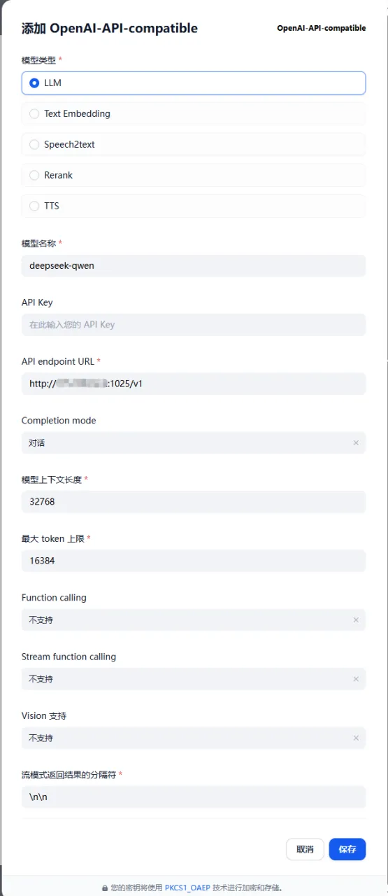 模型类型选择“LLM”,“模型名称”与Mind IE服务化配置dcoker文件“config.json”中的“modelName”保持一致,例如之前配置的是qwen3-32b模型,“API endpoint URL”填写“http://本机ip:qwen3-32b的port端口/v1”,。“模型上下文长度”与“最大 token 上限”按需填写。例如:http://172.16.23.55:1060
