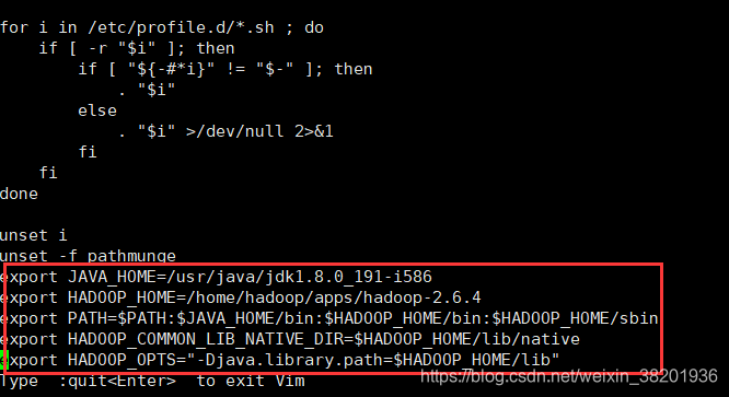 3) vi hadoop-env.sh 进入到文件中 将原来红框中的路径修改成你复制的路径 然后保存退出