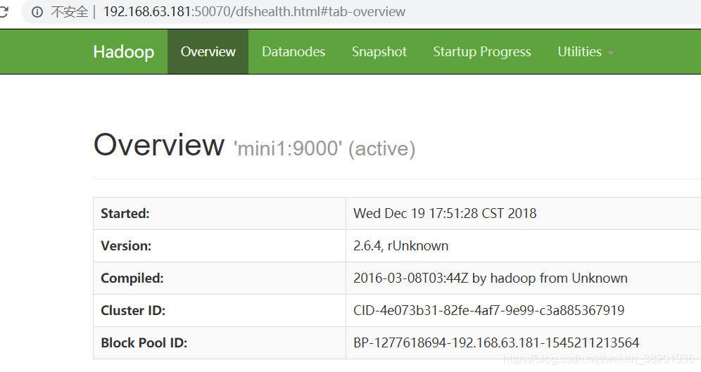 或者 输入主机名 http:mini1:50070 端口号默认是50070 前面的ip地址是你服务器的地址