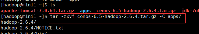 1) tar -zxvf cenos-6.5-hadoop-2.6.4.tar.gz -C apps/ 解压安装包