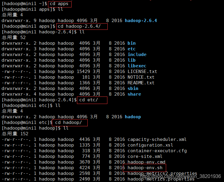 1) cd apps/hadoop-2.6.4/etc/hadoop/ ll 找到 hadoop-env.sh文件