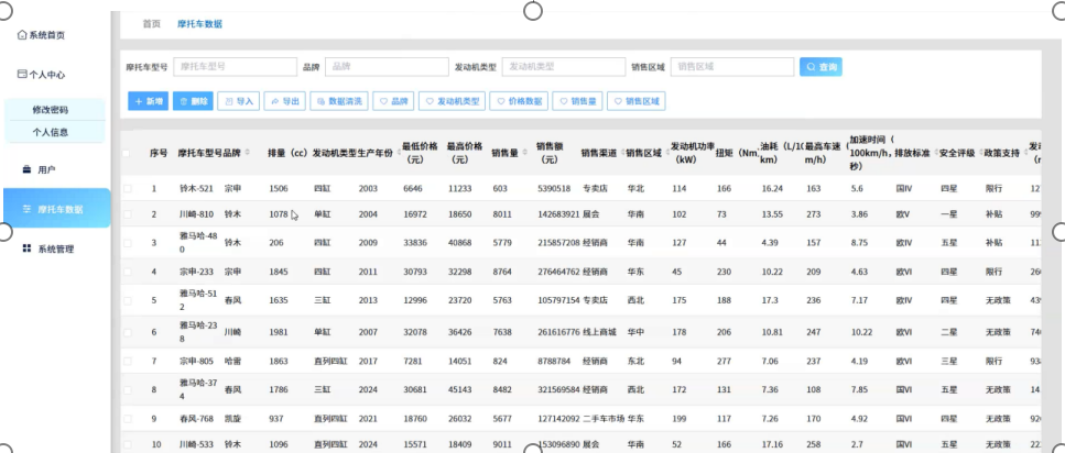 管理系统作为整个系统的核心组成部分之一,提供了丰富的管理功能,如摩托车数据管理和用户管理等。这些功能的实现使得系统能够高效地处理和分析大量摩托车数据,帮助用户更好地了解市场动态和趋势,做出更明智的决策。