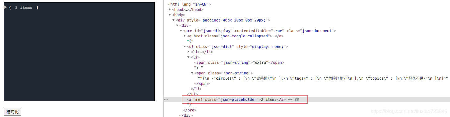 思路:使用jquery拷贝<pre>节点,然后remove那些折叠的节点数据(<a href="" class="json-placeholder">2 items</a>)
