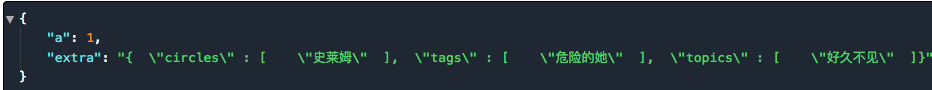 {"a":1,"extra":"{\n \"circles\" : [\n \"史莱姆\"\n ],\n \"tags\" : [\n \"危险的她\"\n ],\n \"topics\" : [\n \"好久不见\"\n ]\n}"}