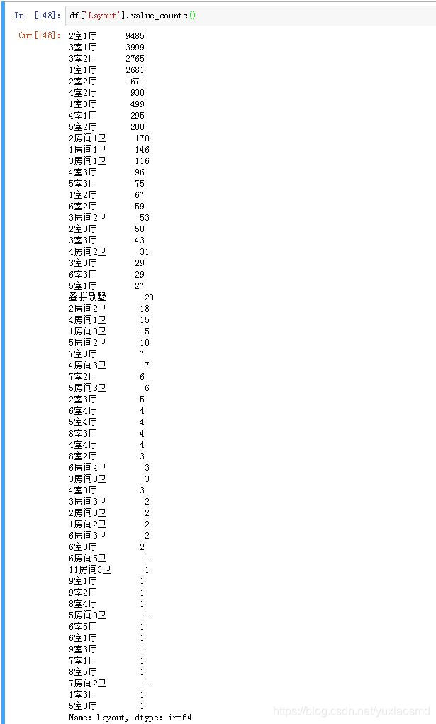 大家也都看到了,特征值并不是像想象中的那么理想。有两种格式的数据,一种是"xx室xx厅",另一种是"xx房间xx卫",但是绝大多数都是xx室xx厅的数据。而对于像"11房间3卫"或者"5房间0卫"这些的Layout明显不是民住的二手房(不在我们的考虑范围之内),因此最后决定将所有"xx房间xx卫"格式的数据都移除掉,只保留"xx室xx厅"的数据。
