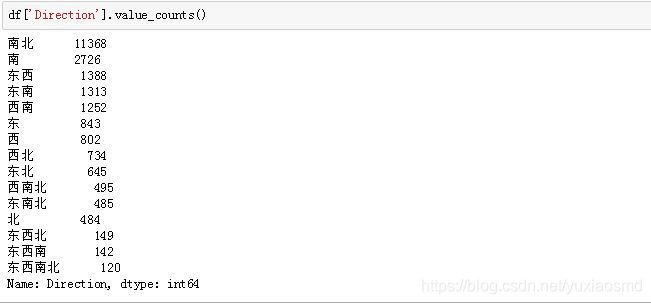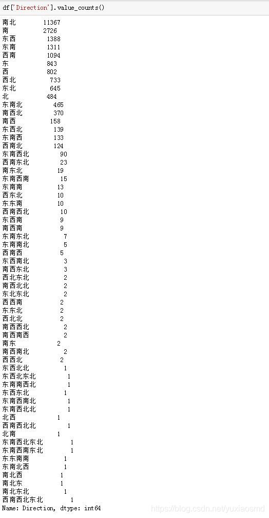 如上所见,像"西南西北北"或者"东东南南"这样的朝向是不符合常识的(反正我是理解不了)。因此,我们需要将这些凌乱的数据进行处理,具体实现方式是博主自己写了一个函数 direct_func,主要思想就是将各种重复但顺序不一样的特征值合并,比如"西南北"和"南西北",并将不合理的一些值移除,如"西南西北北"等。