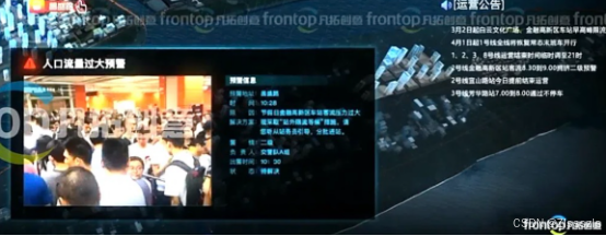 Frontop数字孪生轨道交通解决方案通过道闸、门禁、监控的一体化监测,对进入站点的人员进行识别与轨迹跟踪,识别到人员创卡或者其他人员异常,将实时在地图上进行告警。同时对整个园区的人流进行统一监测,如某一区域人流达到拥挤程度,智能化进行告警