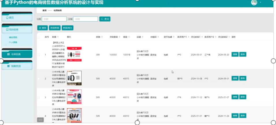 管理员在电商销售信息管理模块中,可以对标题、图片、价格、销量、店铺、关键词、是否包邮、评论时间等信息进行查看、修改、删除的操作。