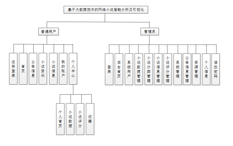 按照基于大数据技术的网络小说智能分析及可视化的角色,系统划分为了普通用户模块和管理员模块这两大部分。