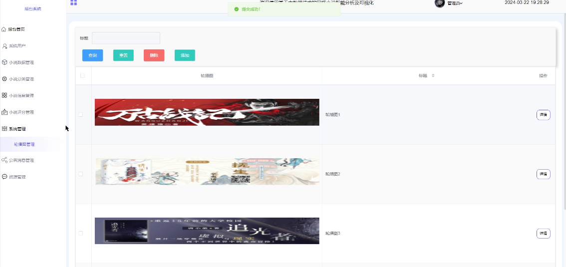 可对首页的轮播图进行管理,进行增删改查操作,支持标题搜索,可点击查看详情(轮播图、标题),界面如下图4-12所示。