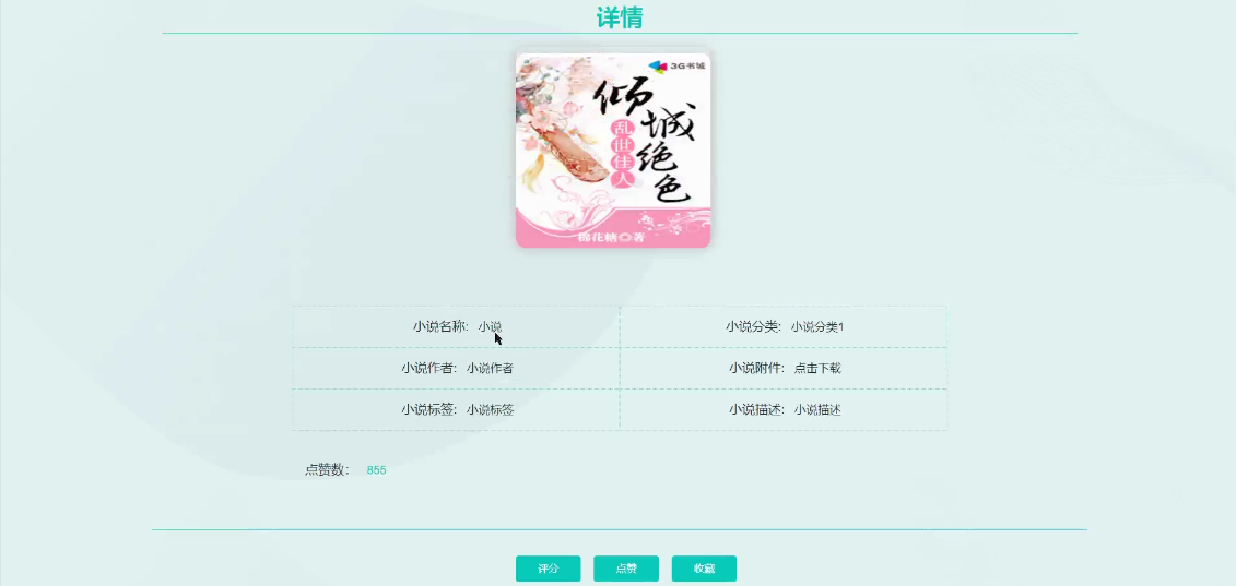 - 小说信息:可查看管理员发布的所有小说信息,支持关键字(小说名称、小说分类)搜索和下拉(小说分类、排序)搜索,点击可查看详情(小说名称、小说分类、小说描述、小说附件、小说标签、小说描述、小说简介等),进行点赞、收藏和评论,并可点击评分操作,填写评分信息(评分分数、评分内容)并提交。