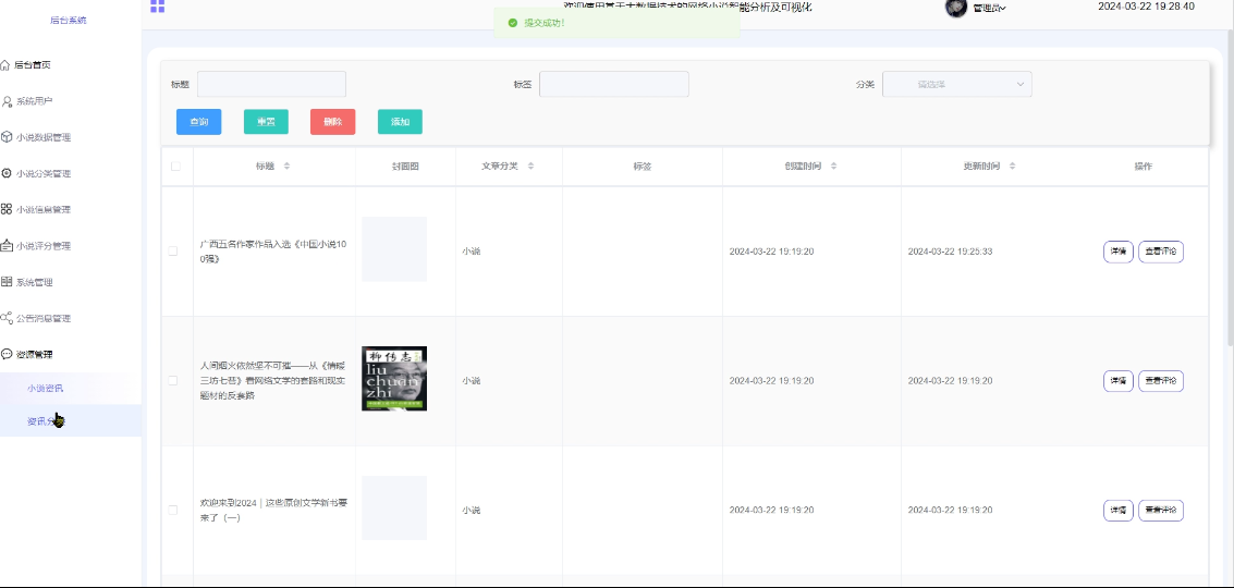 - 资源管理:可对小说资讯和资讯分类进行管理,进行增删改查操作,小说资讯支持标题、标签、分类搜索,可点击查看详情(封面图、标题、分类、标签、描述、正文)和查看评论;资讯分类支持类型名称搜索,可点击查看详情。