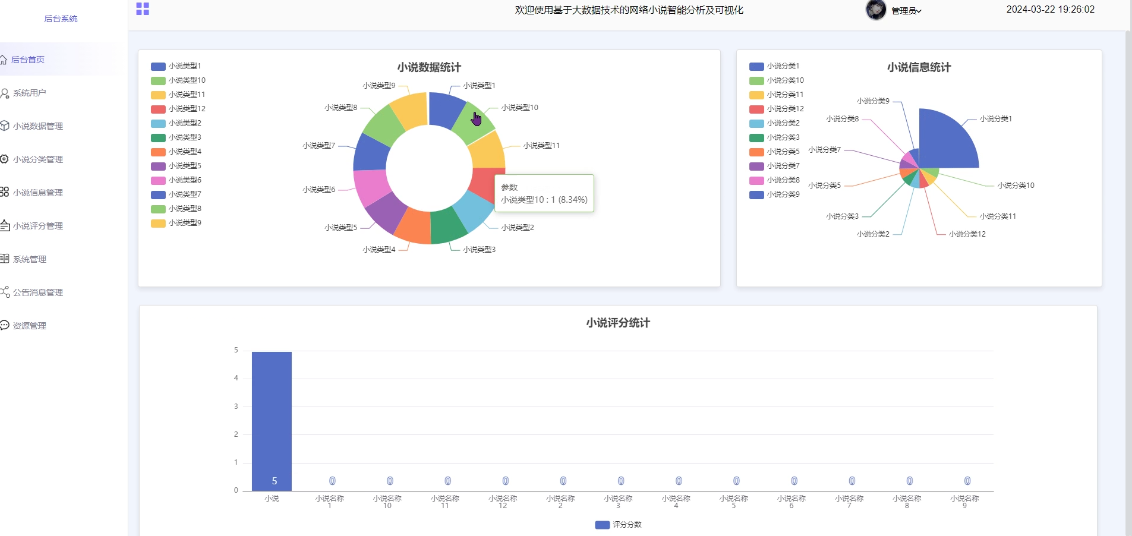 - 后台首页:可查看小说数据统计、小说信息统计、小说评分统计等信息数据分析图表