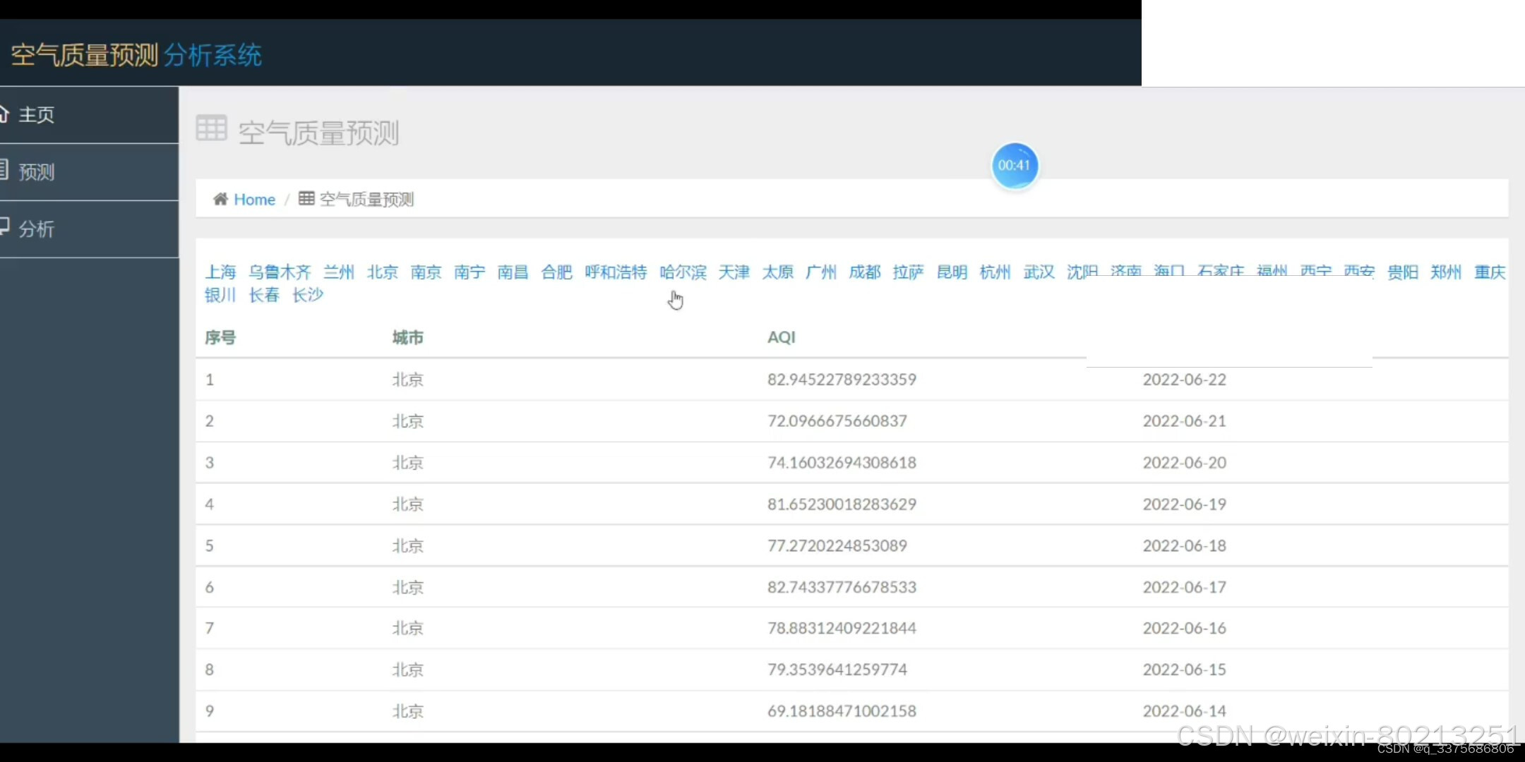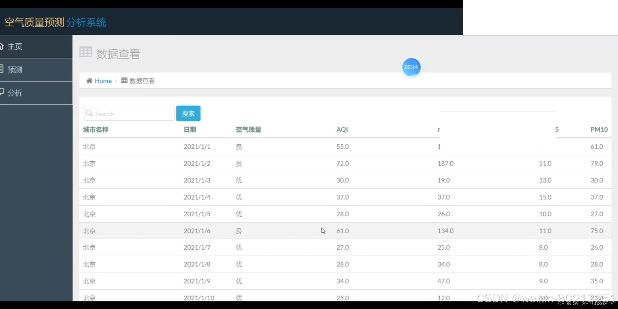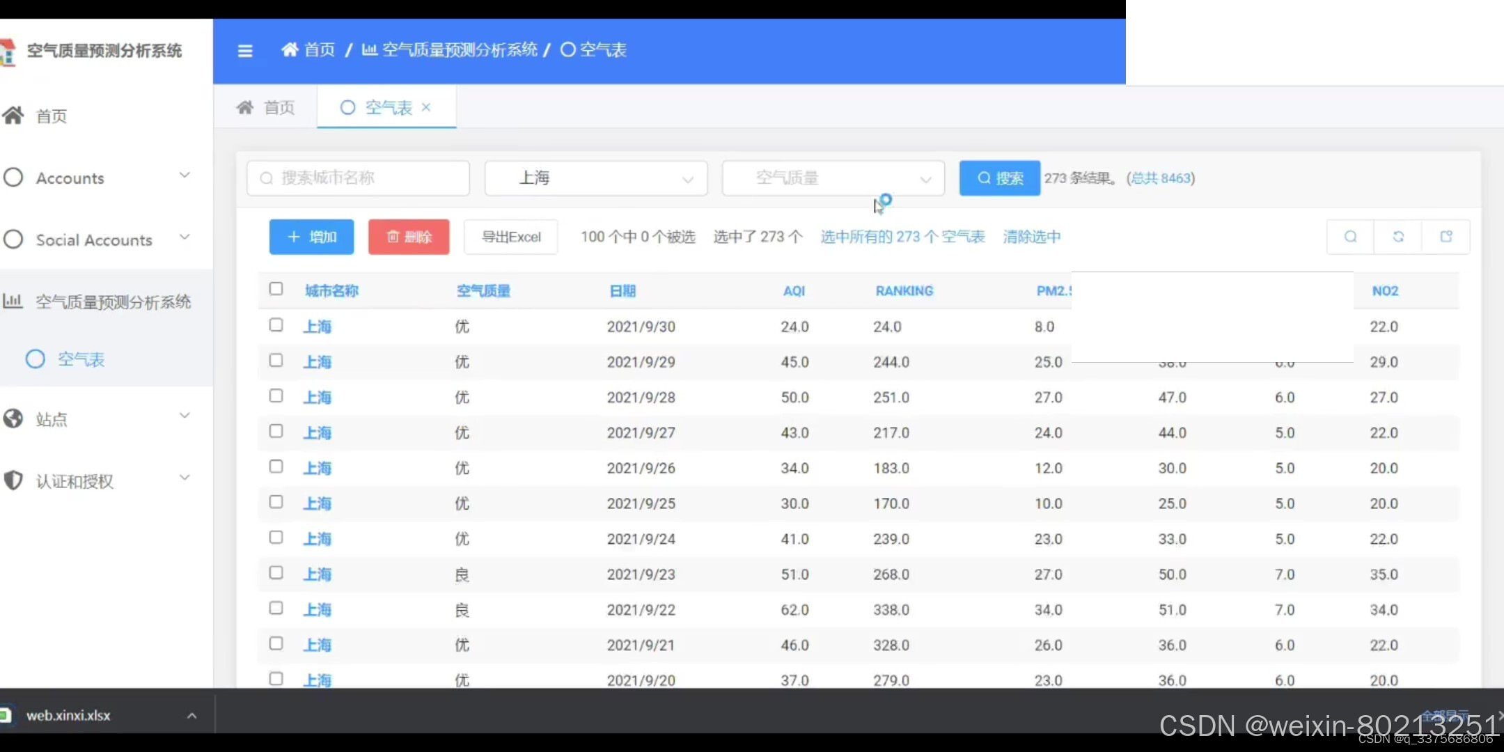 技术栈:Python语言、Django框架、Echarts可视化、HTML、Prophet时间序列算法预测模型本文利用了Python爬虫技术对空气质量网站的数据进行获取,获取之后把数据生成CSV格式的文件,然后再存入数据库方便保存。再从之前九个月的AQI(空气质量指数)的值中进行分析,把数据取出来后,对数据进行数据清洗,最后将数据提取出来做可视化的分析。