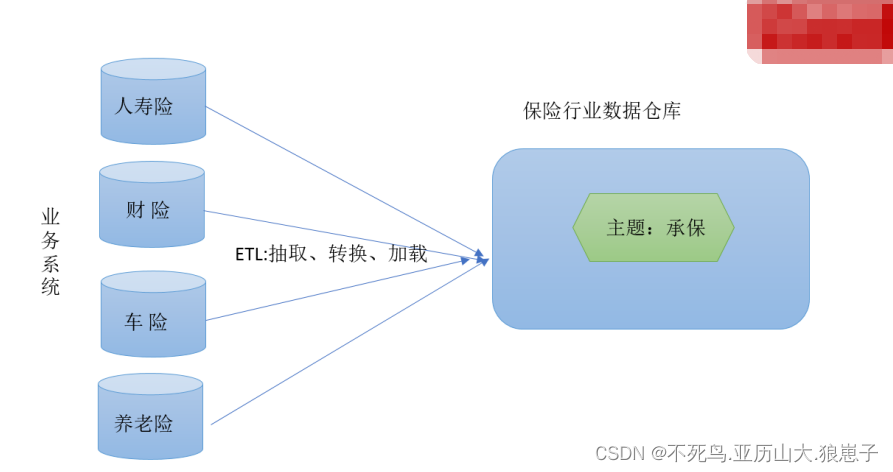 下图说明了保险公司综合数据的简单处理过程,其中数据仓库中与“承保”主题有关的数据来自于多个不同的操作型系统。这些系统内部数据的命名可能不同,数据格式也可能不同。把不同来源的数据存储到数据仓库之前,需要去除这些不一致。