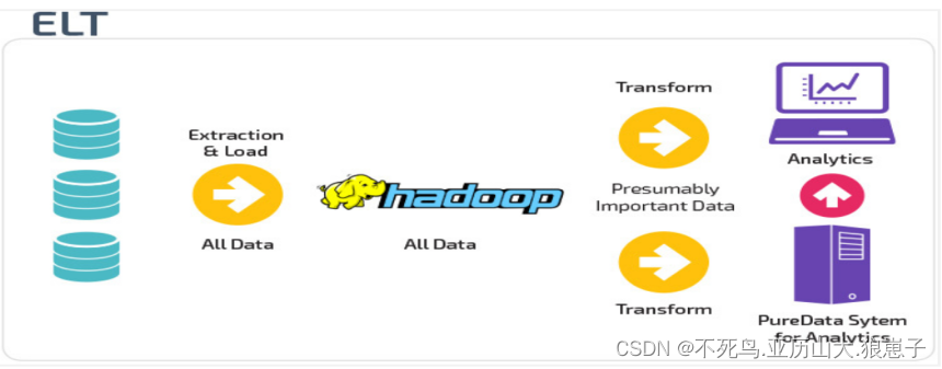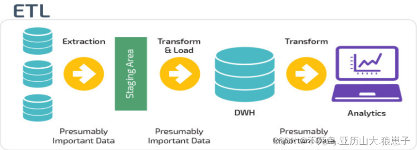 数据仓库从各数据源获取数据及在数据仓库内的数据转换和流动都可以认为是ETL(抽取Extra, 转化Transfer, 装载Load)的过程。但是在实际操作中将数据加载到仓库却产生了两种不同做法:ETL和ELT。