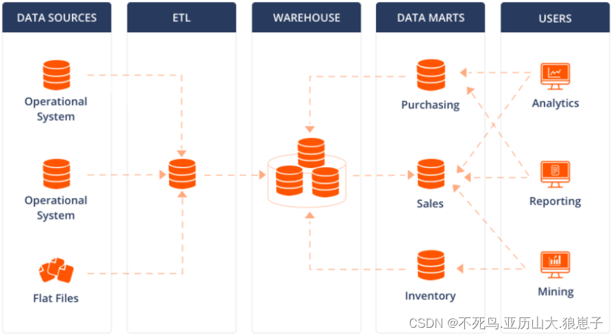 数据仓库中有不同主题数据,数据集市则根据部门特点面向指定主题,比如Purchasing(采购)、Sales(销售)、Inventory(库存);