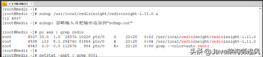[root@Redis ~]# nohup /usr/local/redisinsight/redisinsight-linux64-1.4.0 & // 后台运行[root@Redis ~]# ps aux | grep redis // 查看进程是否存在