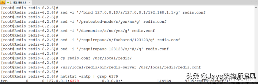 [root@Redis ~]# wget https://download.redis.io/releases/redis-6.2.6.tar.gz[root@Redis ~]# tar zxf redis-6.2.6.tar.gz[root@Redis ~]# cd redis-6.2.6[root@Redis redis-6.2.6]# make PREFIX=/usr/local/redis install[root@Redis redis-6.2.6]# sed -i '/^bind 127.0.0.1/s/127.0.0.1/192.168.1.1/g' redis.conf # 修改监听 IP[root@Redis redis-6.2.6]# sed -i '/protected-mode/s/yes/no/g' redis.conf # 关闭保护模式[root@Redis redis-6.2.6]# sed -i '/daemonize/s/no/yes/g' redis.conf # 开启后台运行[root@Redis redis-6.2.6]# sed -i '/requirepass/s/foobared/123123/g' redis.conf # 配置密码[root@Redis redis-6.2.6]# sed -i '/requirepass 123123/s/^#//g' redis.conf # 将密码前的 # 删除[root@Redis redis-6.2.6]# cp redis.conf /usr/local/redis/[root@Redis redis-6.2.6]# /usr/local/redis/bin/redis-server /usr/local/redis/redis.conf # 启动 Redis