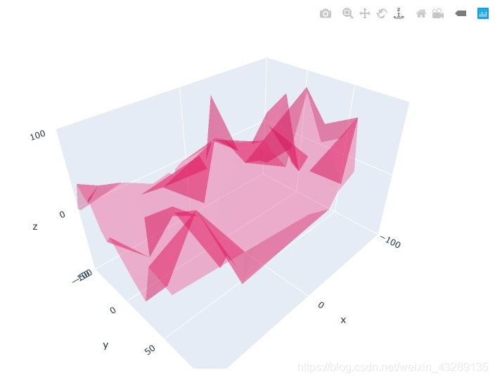 使用plotly画三维立体高逼格图,代码传送门:import plotly.graph_objects as goimport numpy as npnp.random.seed(1)N = 70fig = go.Figure(data=[go.Mesh3d(x=(70*np.random.randn(N)),y=(55*np.random...