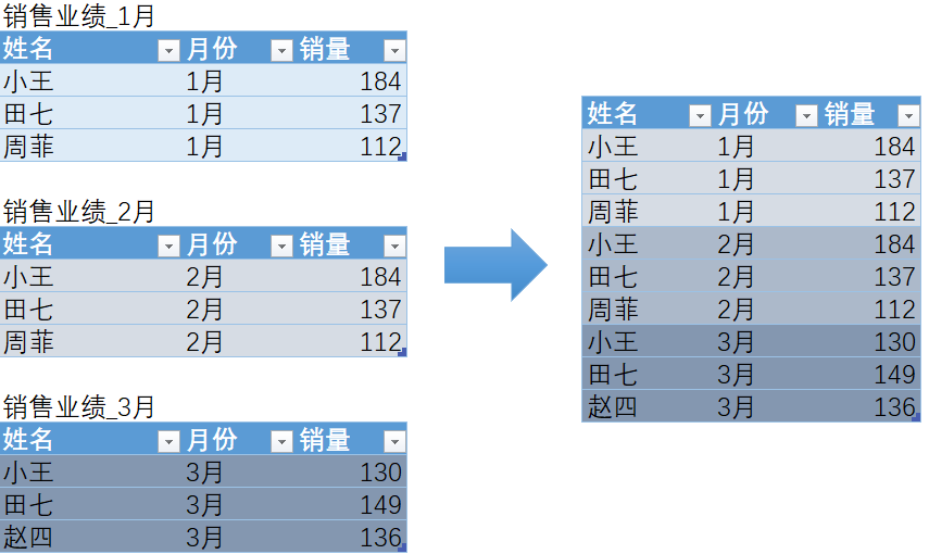 =VSTACK(销售业绩_1月[#全部],销售业绩_2月,销售业绩_3月)
