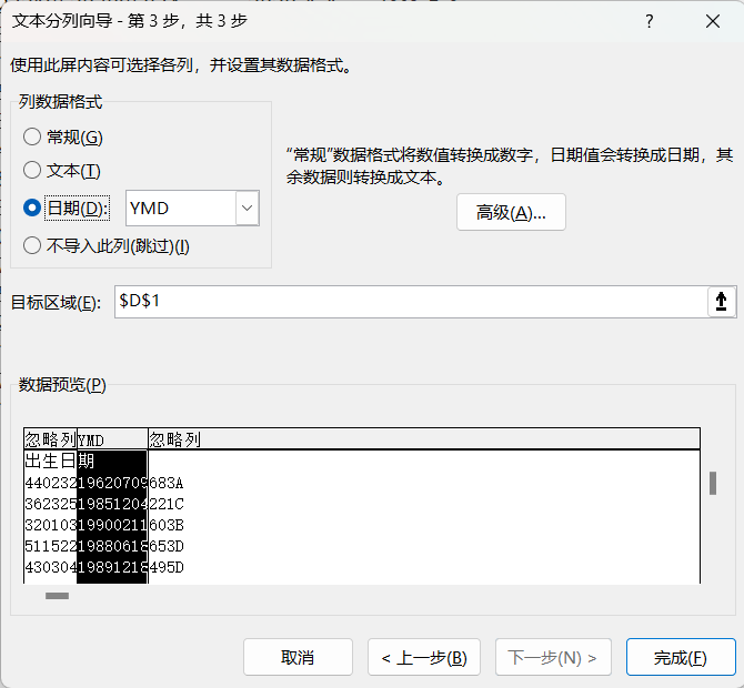 数据-分列-固定宽度-手动划分-不需要的列选择“不导入此列”-需要的列设置对应的格式