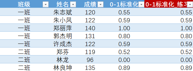 =([@成绩]-MIN([成绩]))/(MAX([成绩])-MIN([成绩]))
