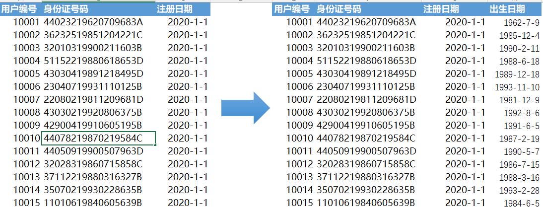 输入公式:=TEXT(MID([@身份证号码],7,8),"00-00-00")