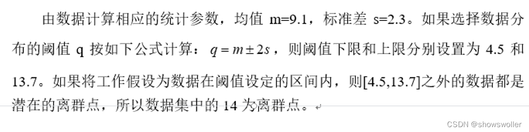 【例10-1】假设某类数据总体服从正态分布,现有部分数据{6,7,6,8,9,10,8,11,7,9,12,7,11,8,13,7,8,14,9,12},基于统计方法检测离群点