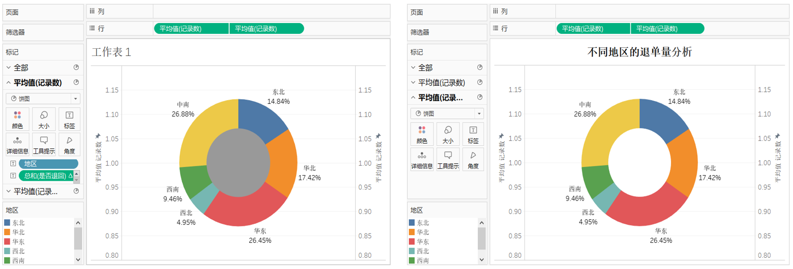 例如,要创建不同地区退单量的环形图,具体步骤如下: