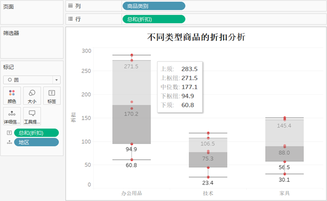 将“商品类别”和“地区”拖放到列功能区,将“折扣”拖放到行功能区,Tableau将创建一个条形图。单击工具栏中的“智能显示”按钮,然后选择“盒须图”视图类型。