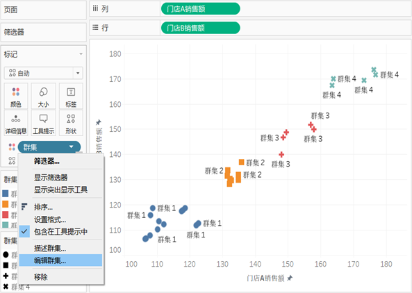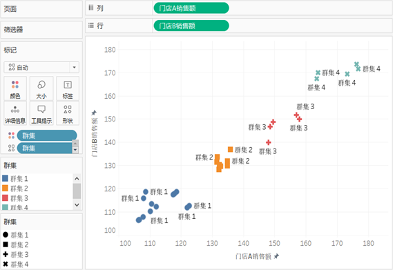 将生成的“群集”字段添加到“标记”卡上的“标签”和“形状”控件,然后,对视图进行适当的美化,聚类分析的结果如图所示。