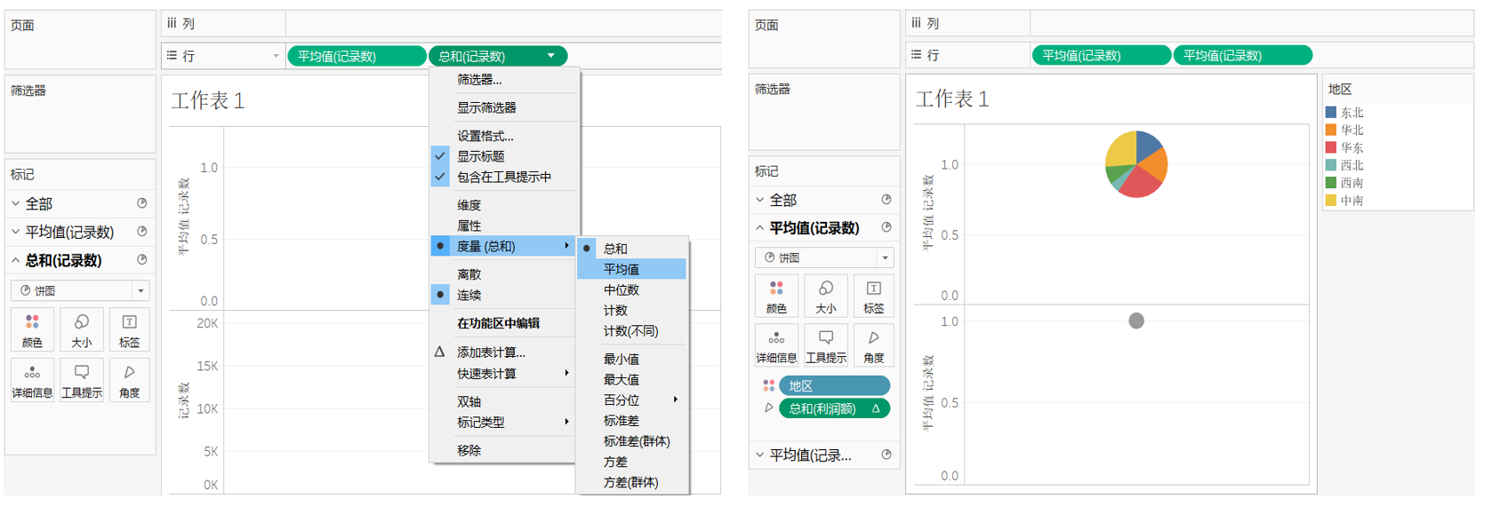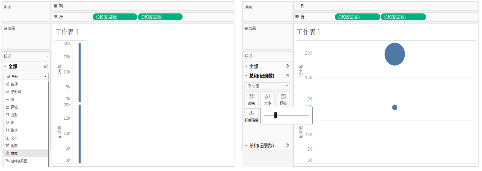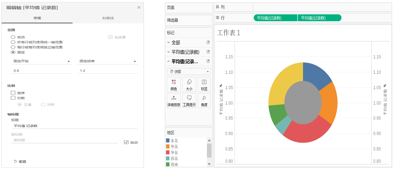 将度量中的“记录数”拖放到行功能区,重复两次操作,并在标记卡上选择“饼图”。