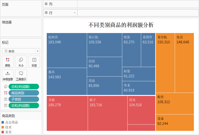 将“商品类别”拖放到标记卡的“颜色”上,视图将被分为三个独立的区域,“商品类别”将确定矩形的颜色。将“销售额”拖放到标记卡的“标签”上,并为视图添加标题等。