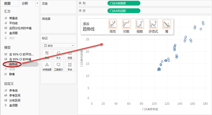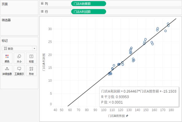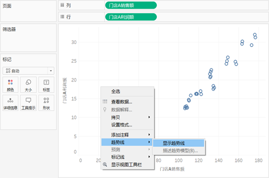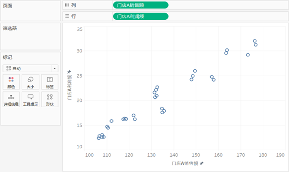 将“门店A销售额”与“门店A利润额”分别拖至行功能区和列功能区,然后通过菜单栏“分析”下的“聚合度量”对变量进行解聚,生成简单散点图。