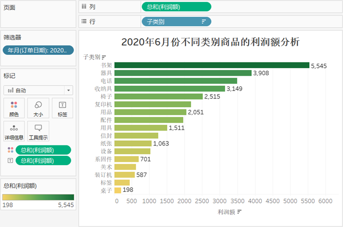 - 然后将“利润额”字段拖入“颜色”和“标签”标记,设置图形颜色,并添加视图标题等。