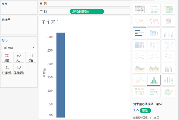 在度量中选择“销售额”字段,将其拖放到行功能区,还需要单击“智能显示”中的直方图视图,用于创建直方图。显示企业在各个销售额区间的订单次数。