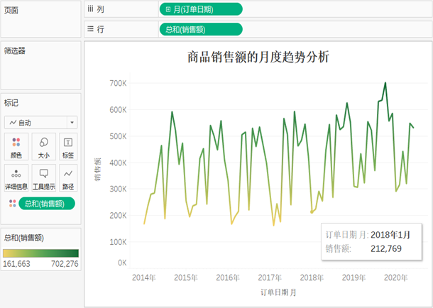 然后将“销售额”字段拖放到“颜色”标记,为视图添加标题,进一步编辑颜色和美化视图。