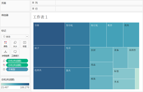 将“子类别”拖放到列功能区,将“利润额”拖放到行功能区,当列功能区上有一个维度且行功能区上有一个度量时,Tableau会显示一个默认图表,单击工具栏上的“智能显示”按钮,然后选择“树状图”视图类型。