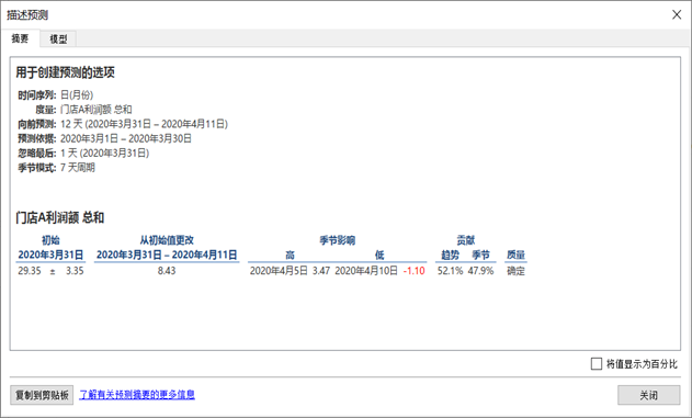 - 在“摘要”选项卡中,描述了已创建的预测模型,上半部分汇总了Tableau创建预测所用的选项,一般由软件自动选取,也可以在“预测选项”对话框中指定。